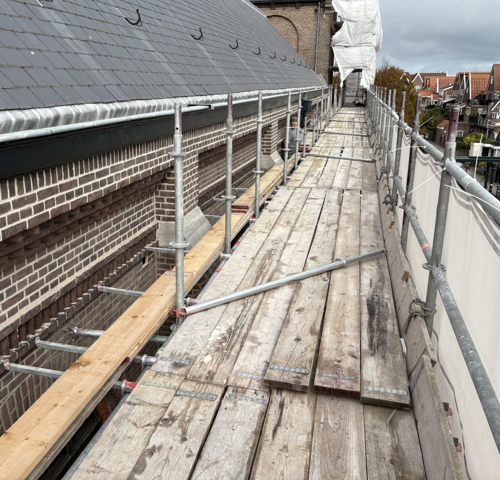 We zijn volop bezig met het voeg- en herstelwerk aan de zeezijde van de Vincentiuskerk. Op bijgevoegde foto’s kunt u zien in welke zeer slechte staat het verkeerde en hoe broodnodig het is dat dit gebeurt.