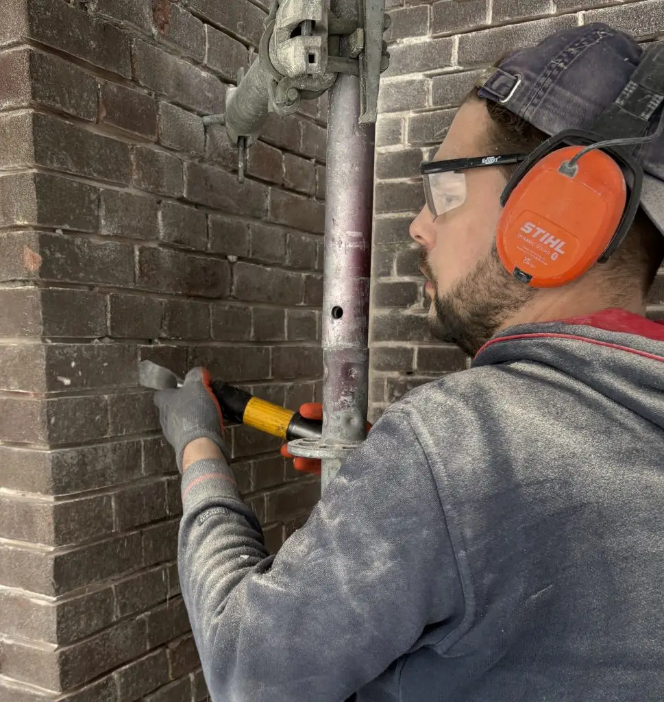 Stof van het slijpen wordt d.m.v. een stofzuiger opgevangen en netjes in de afvalcontainer gegooid. Daarna worden de overige stukken voeg cm. voor cm. uitgehakt.