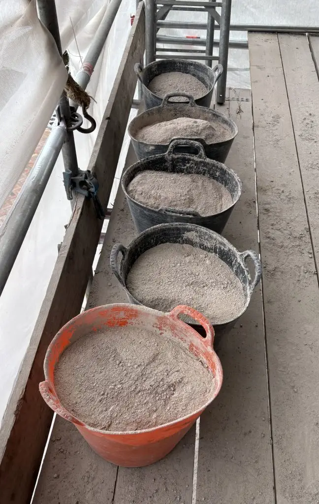 Deze week schieten de mannen goed op met het inslijpen en hakken van het bestaande voegwerk. Hopelijk kunnen we eind deze week een deel van de gevel schoonspuiten zodat de voegers van Kwakman kunnen starten.