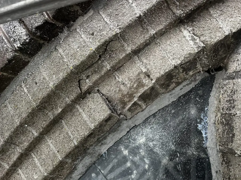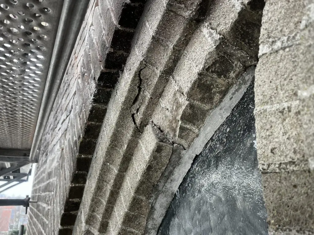 Bij de kopgevel aan de grafzijde komen we stevige uitdagingen tegen. Met name boven de gebrandschilderde glas-in-loodramen zijn de buitenranden op veel plekken gescheurd en is veel van het voegwerk van de voorzetramen in slechte staat. Deze herstelwerkzaamheden worden gelijk goed uitgevoerd nu de steiger er toch staat. Uiteraard geschiedt alles in overleg met de gemeente. We hebben hiervoor een vakman ingeschakeld die met veel passie en verstand alle slechte plekken herstelt.