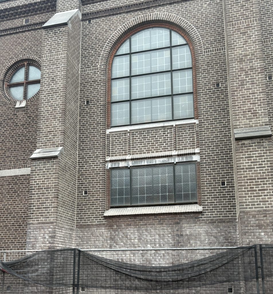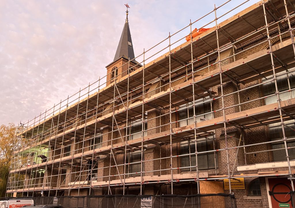 Vandaag is het eerste gedeelte gevelsteiger gedemonteerd. Het materieel wordt morgen afgevoerd. De metselaar is al volop bezig met de gevelreparaties en reparaties randstenen glas-in-loodramen op de hoge steiger.