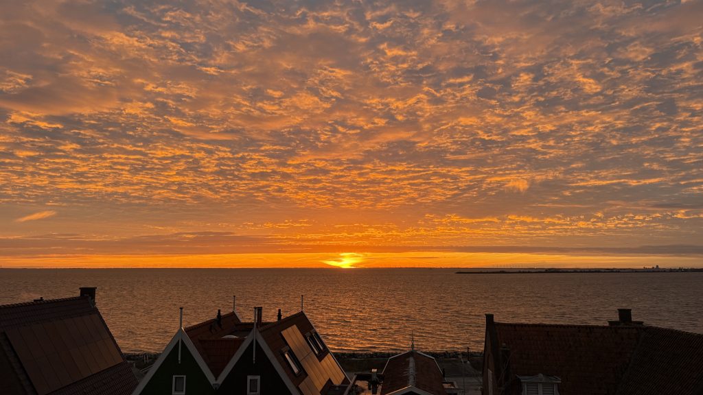 Ondanks een paar regenachtige werkdagen gaan de voeg- en schilderwerkzaamheden voorspoedig. Vanaf de steiger is het de laatste ochtenden genieten van de opkomende zon.