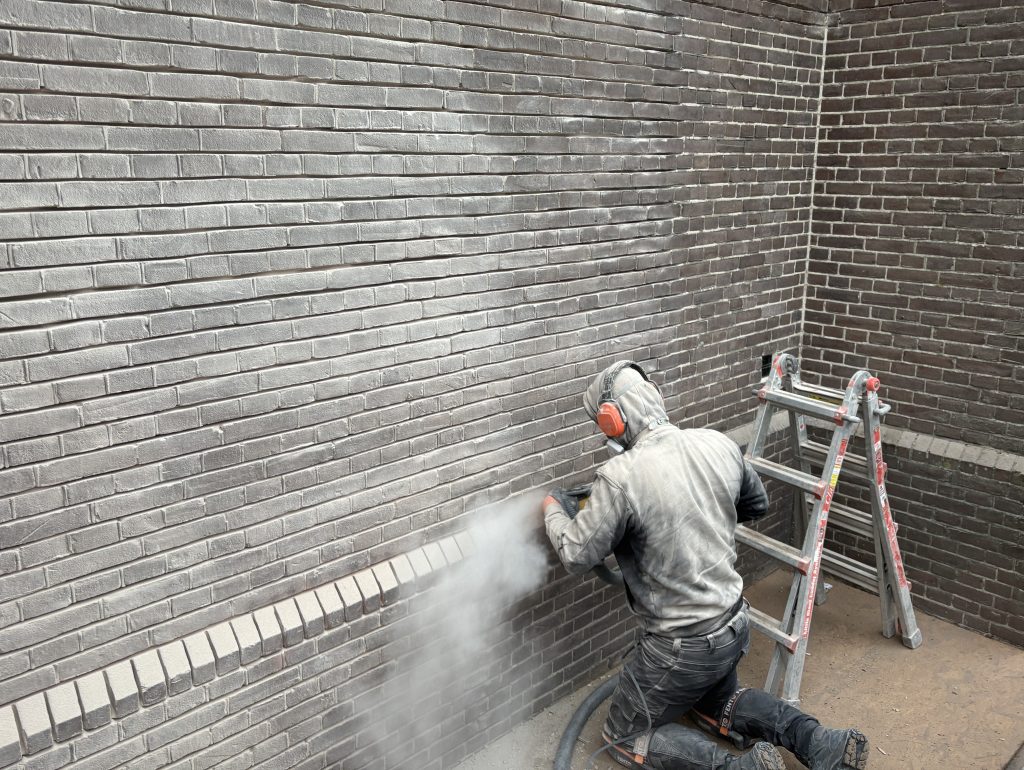 Stof van het slijpen wordt d.m.v. een stofzuiger opgevangen en netjes in de afvalcontainer gegooid. Daarna worden de overige stukken voeg cm. voor cm. uitgehakt.
